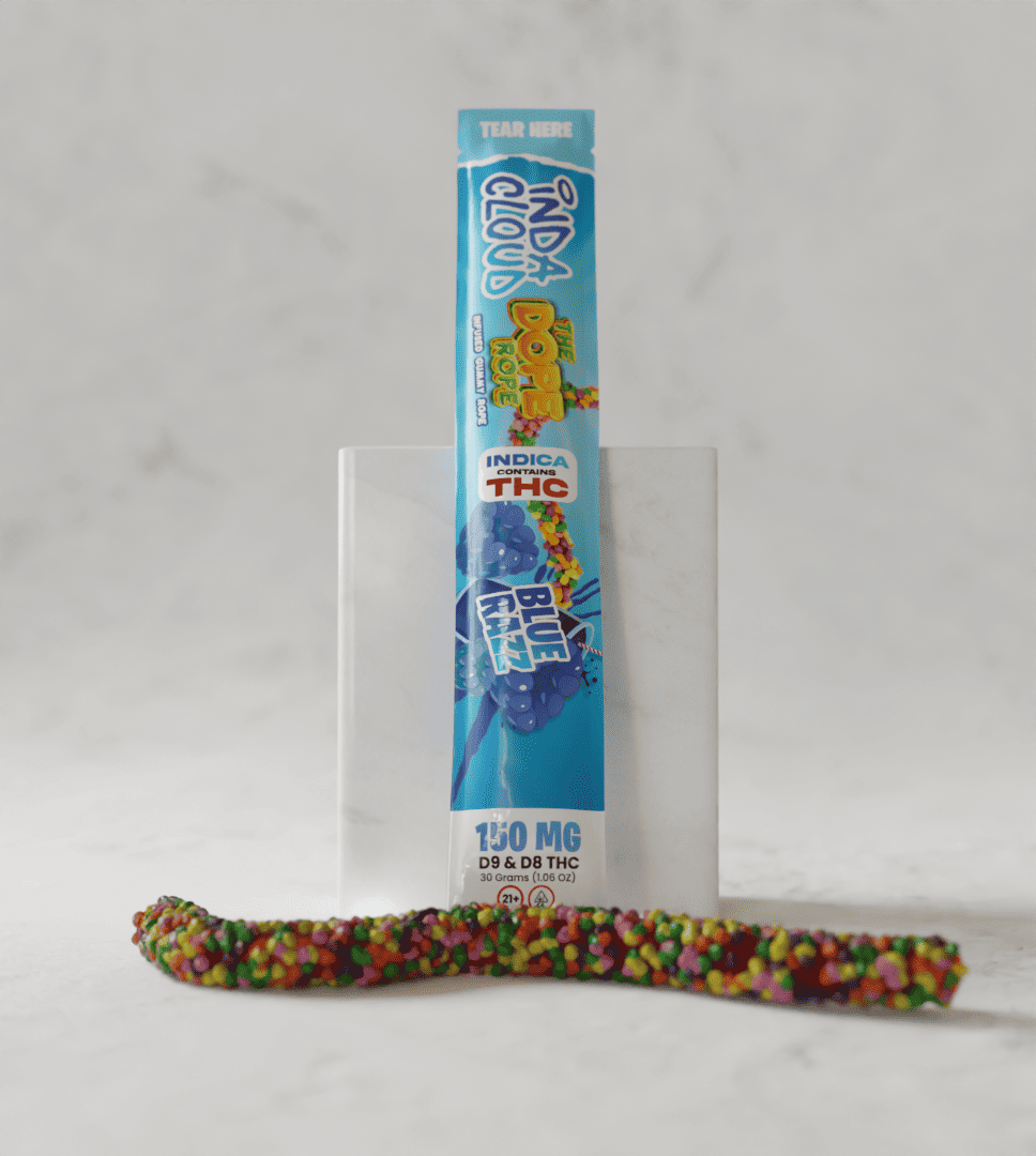 Your favorite Blue Razz flavor in a Dope Rope contains an intense blend of approx 150mg of Indica Delta 9 and Delta 8 THC.