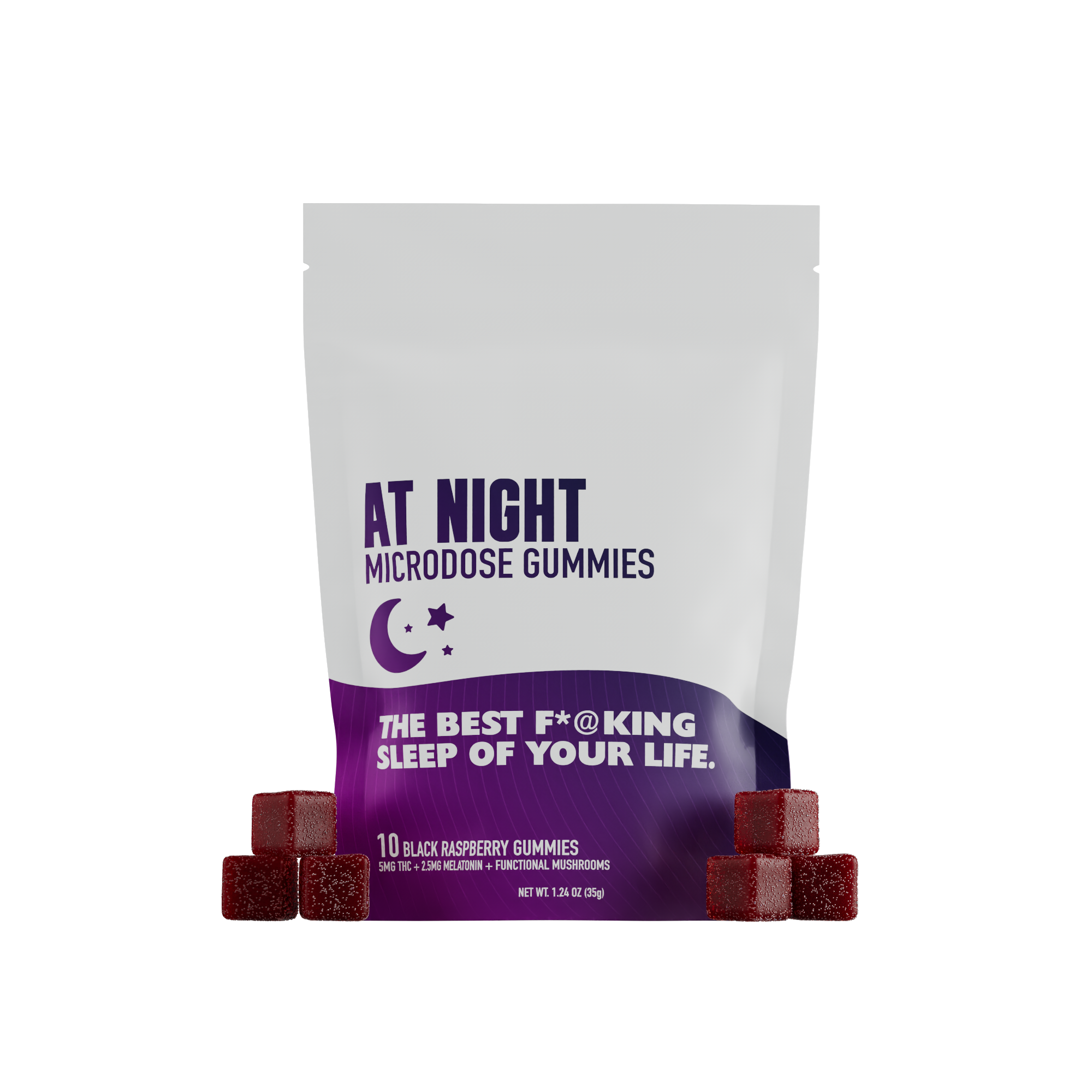 Drift into dreamland with ‘At Night’ featuring 5mg of Delta 9 THC, 2.5mg of Melatonin, plus 500mg of a proprietary Reishi mushroom blend. Designed for those who seek the ultimate shut-eye. ‘At Night’ offers you the best f*cking sleep of your life. Close your eyes and let the night take the lead.